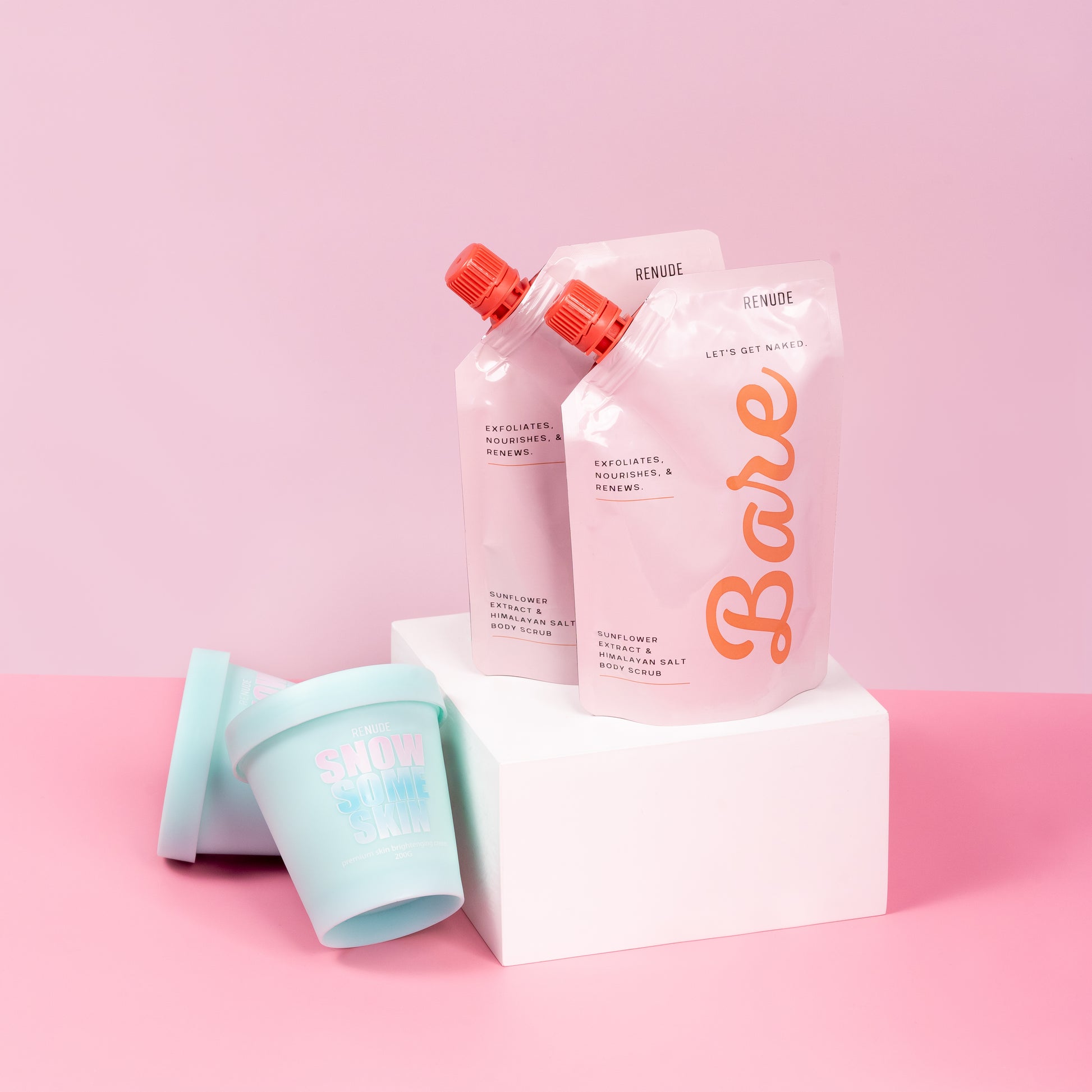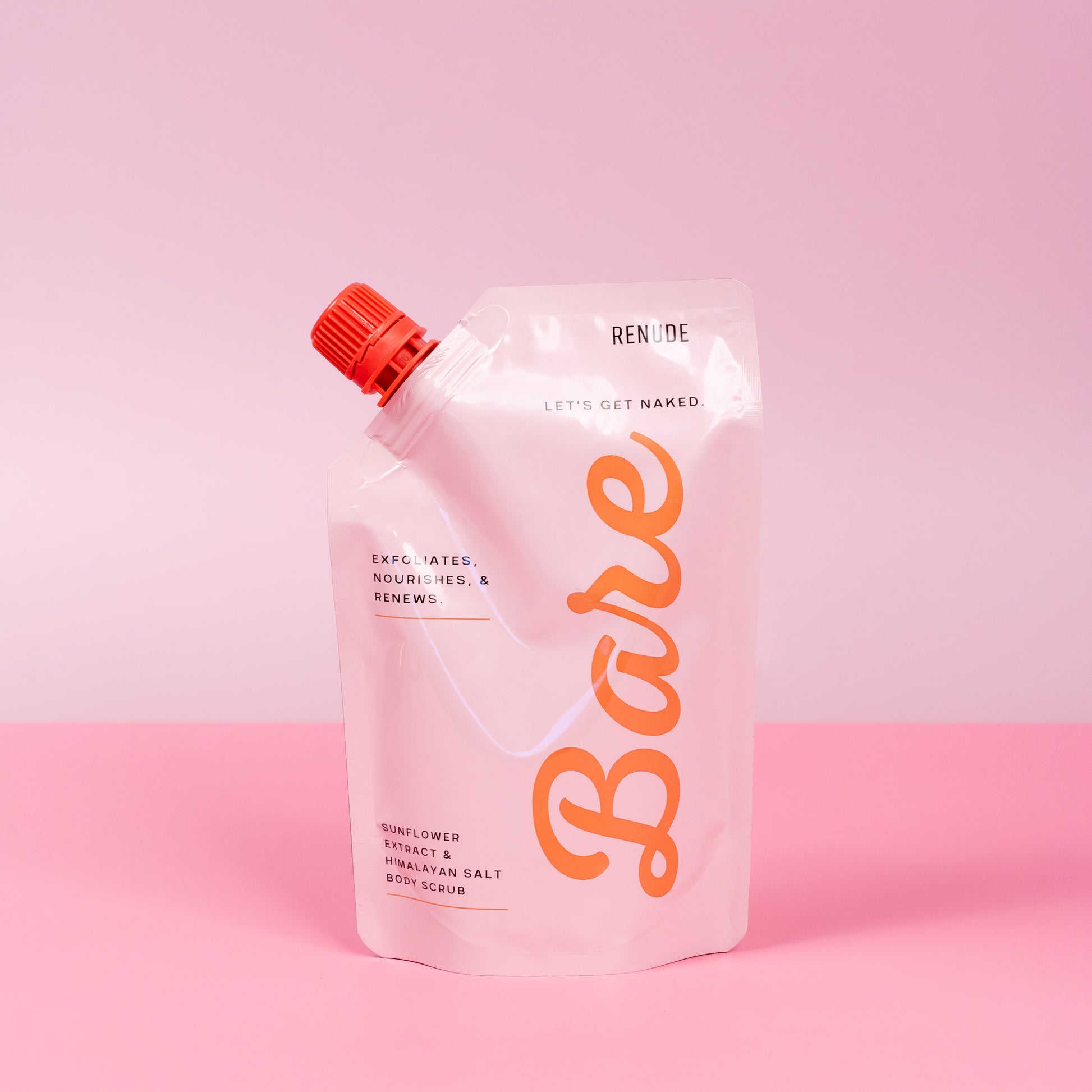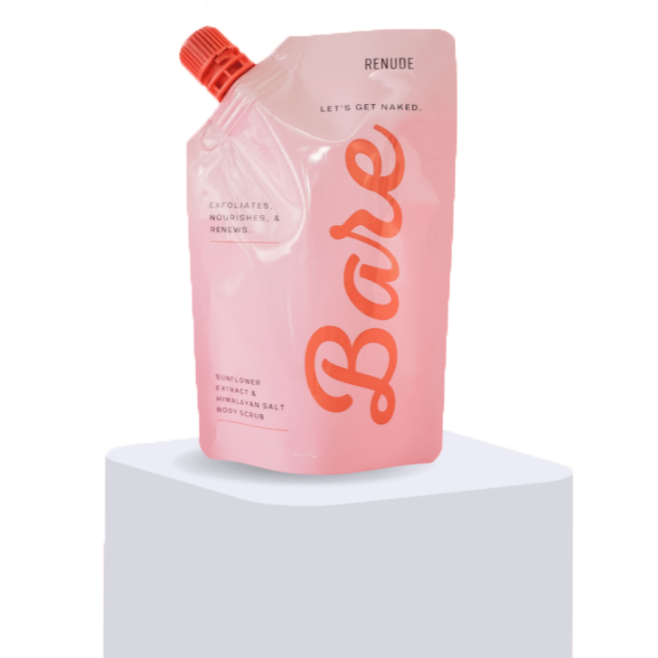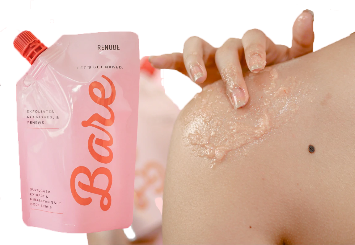 Renude Bare Body Scrub is designed for rough texture/KP (chicken skin), bacne, dark or dry patches on elbows, knees, butt, and arms. The fine Himalayan salt smooths while sunflower oil + vitamin E cushion and nourish.